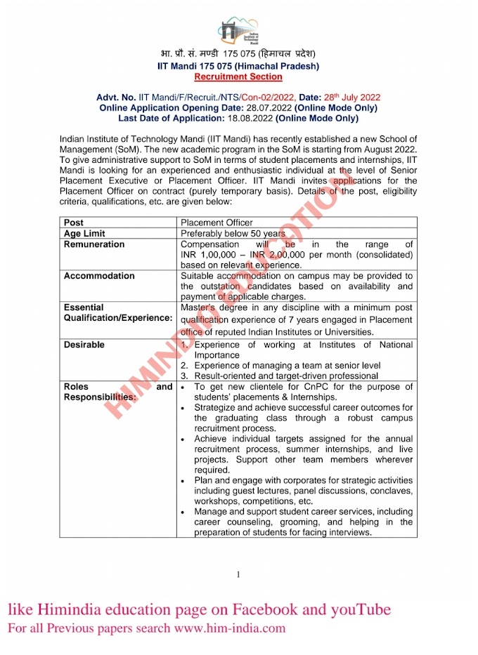 JOB UPDATE Applications are invited for the post of Placement Officer at IIT Mandi 18th August, 2022 from the eligible …
