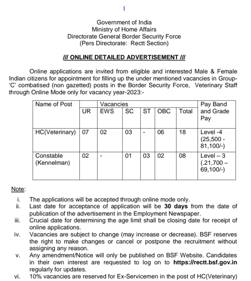 Border Security Force () is inviting applications from eligible Indian citizens for the post of HC (Veterinary), Constable (Kennel man), ASI(Compositor & Machine man), and HC(Inker & Ware Houseman). As per the Recruitment notification, there are total 31 vacancies. The minimum age required for applying for this job post is 18 years and the maximum age limit for all the posts varies.