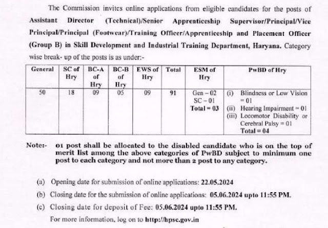 Advt No. 15/2024 - Assistant Director (Technical)/ Senior Apprenticeship Supervisor/Principal/Vice Principal /Principal (Footwear) /Training Officer/Apprenticeship and Placement Officer (Group B) in Skill Development and Industrial Training Department, Haryana.